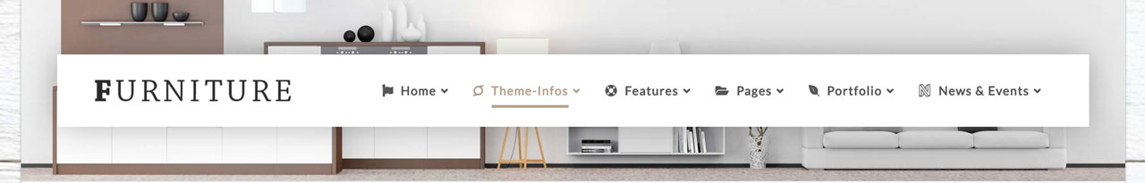 • Header: 14 Varianten für die Positionierung von Logo & Navigation, Hintergrundfarbe (Normal &Sticky), Breite, Abstände, mobile Navigation für Desktop und vieles mehr.