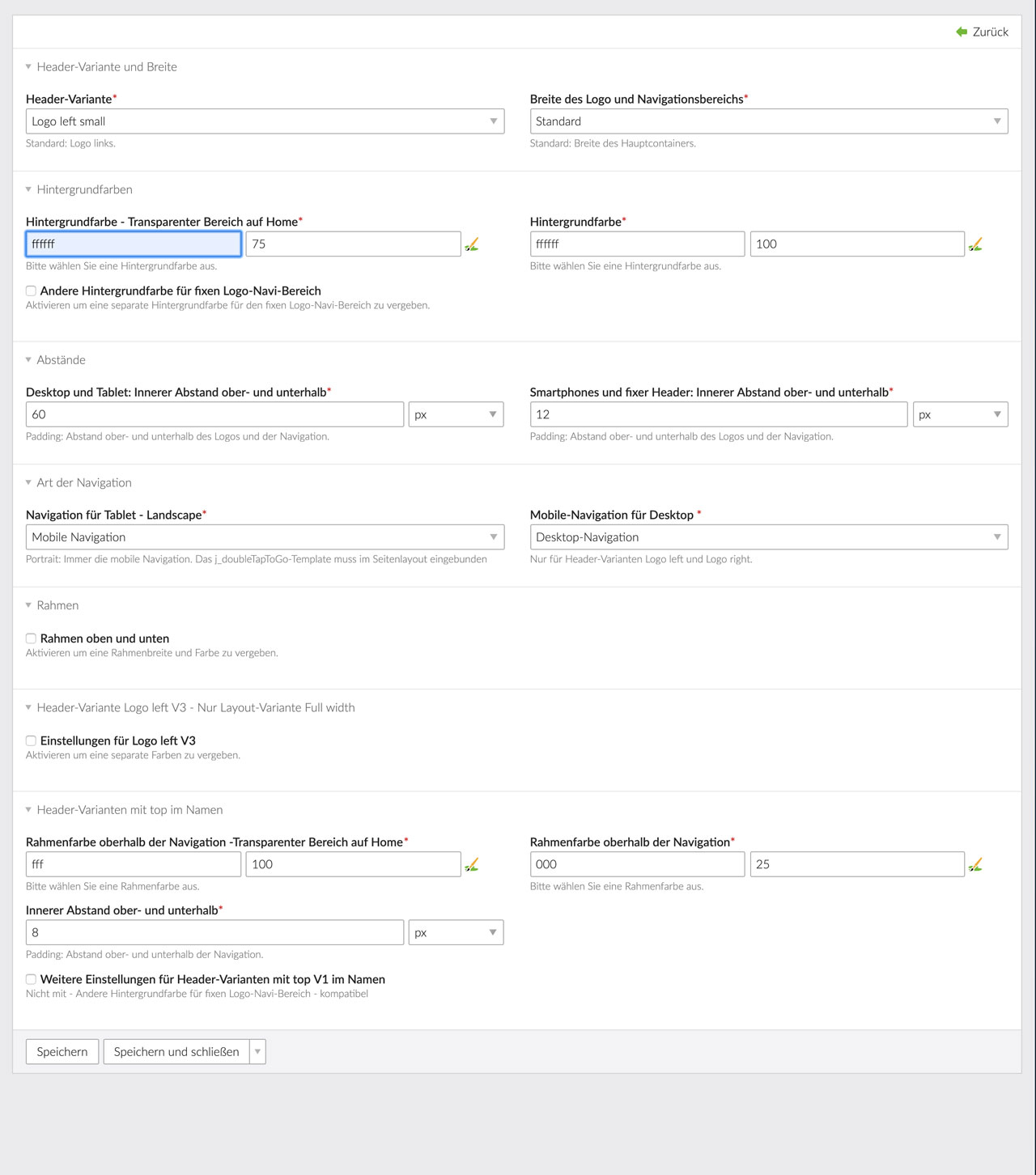 • Topbar: Hintergrund- und Schriftfarben, Schriftgröße, Breite, Border top & bottom.